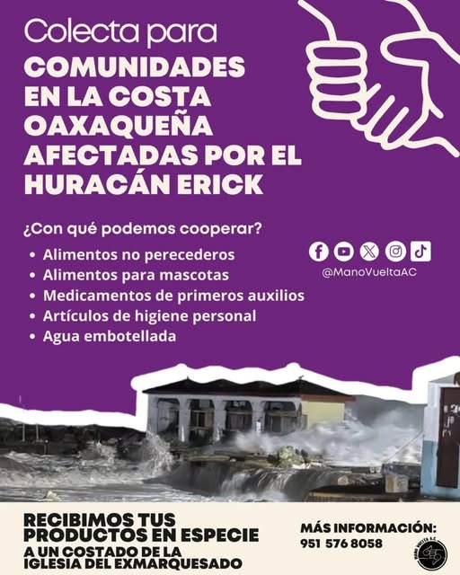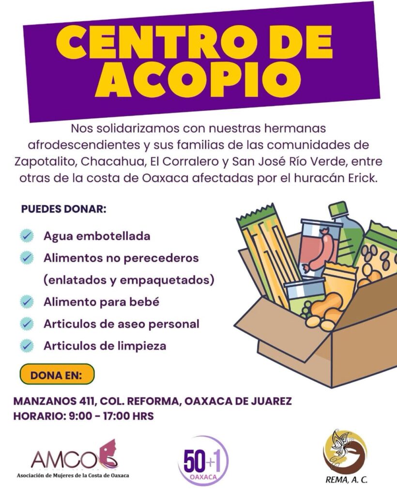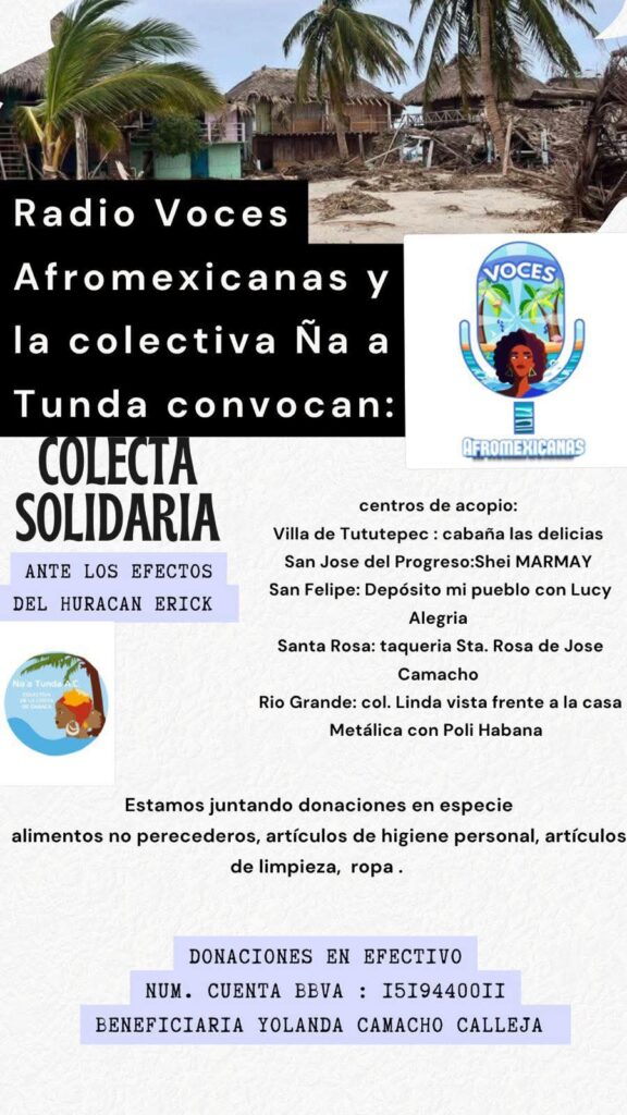 En esta situación, las organizaciones como Mano Vuelta, la Asociación de Mujeres de la Costa de Oaxaca (AMCO), la colectiva Ña´a Tunda e integrantes de la radio Voces Africanas. Así como organizaciones y colectivos de Mujeres Afromexicanas en Movimiento Mano Amiga de la Costa Chica A. C. AfroPoderosas (MUAFRO), solicitan de manera solidaria a la sociedad civil ayuda para las comunidades afectadas, por el huracán.